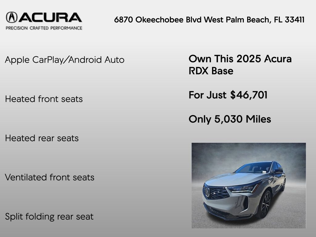 This RDX is well equipped with Apple CarPlay/Android Auto, Heads-Up Display, Heated front seats, Heated rear seats, Heated steering wheel, Memory seat, Navigation system: Acura Navigation System with 3D View, Power driver seat, Power Liftgate, Power moonroof, Remote keyless entry, Split folding rear seat, Ventilated front seats, 16 Speakers, 4-Wheel Disc Brakes, ABS brakes, Adaptive suspension, Air Conditioning, Alloy wheels, AM/FM radio: SiriusXM, Auto High-beam Headlights, Auto-dimming Rear-View mirror, Automatic temperature control, Brake assist, Bumpers: body-color, Compass, Delay-off headlights, Driver door bin, Driver vanity mirror, Dual front impact airbags, Dual front side impact airbags, Electronic Stability Control, Emergency communication system: AcuraLink, Exterior Parking Camera Rear, Four wheel independent suspension, Front anti-roll bar, Front Bucket Seats, Front Center Armrest, Front dual zone A/C, Front fog lights, Front reading lights, Fully automatic headlights, Garage door transmitter: HomeLink, Heated & Ventilated Front Sport Seats, Heated door mirrors, Illuminated entry, Knee airbag, Lane departure: Lane Keeping Assist System (LKAS) active, Low tire pressure warning, Occupant sensing airbag, Outside temperature display, Overhead airbag, Overhead console, Panic alarm, Passenger door bin, Passenger vanity mirror, Perforated Milano Premium Leather-Trimmed Interior, Power door mirrors, Power passenger seat, Power steering, Power windows, Radio data system, Radio: ELS Studio 3D Premium Audio System, Rain sensing wipers, Rear anti-roll bar, Rear reading lights, Rear seat center armrest, Rear window defroster, Rear window wiper, Security system, Speed control, Speed-sensing steering, Spoiler, Sport steering wheel, Steering wheel mounted audio controls, Tachometer, Telescoping steering wheel, Tilt steering wheel, Traction control, Trip computer, Turn signal indicator mirrors, Variably intermittent wipers, and Wheels: 20" x 8.0J Berlina Black Machine-Finished. Price does not include $1,199 predelivery service fee, tax, title, or license. Optional equipment and accessories available, see dealer for details. *Some of our pre-owned vehicles may be subject to unrepaired safety recalls. Check for a vehicle's unrepaired recalls by VIN at http://vinrcl.safercar.gov/vin.