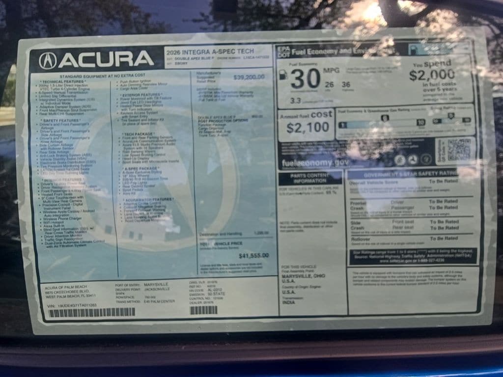 2026 Acura Integra 4D Hatchback A-Spec Tech Package Double Apex Blue Pearl 1.5L I4 DOHC 16V 6-Speed Manual FWD