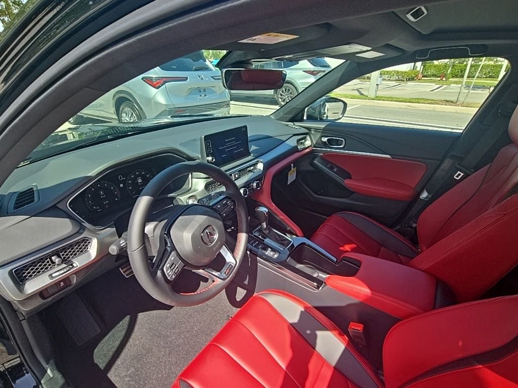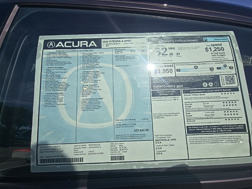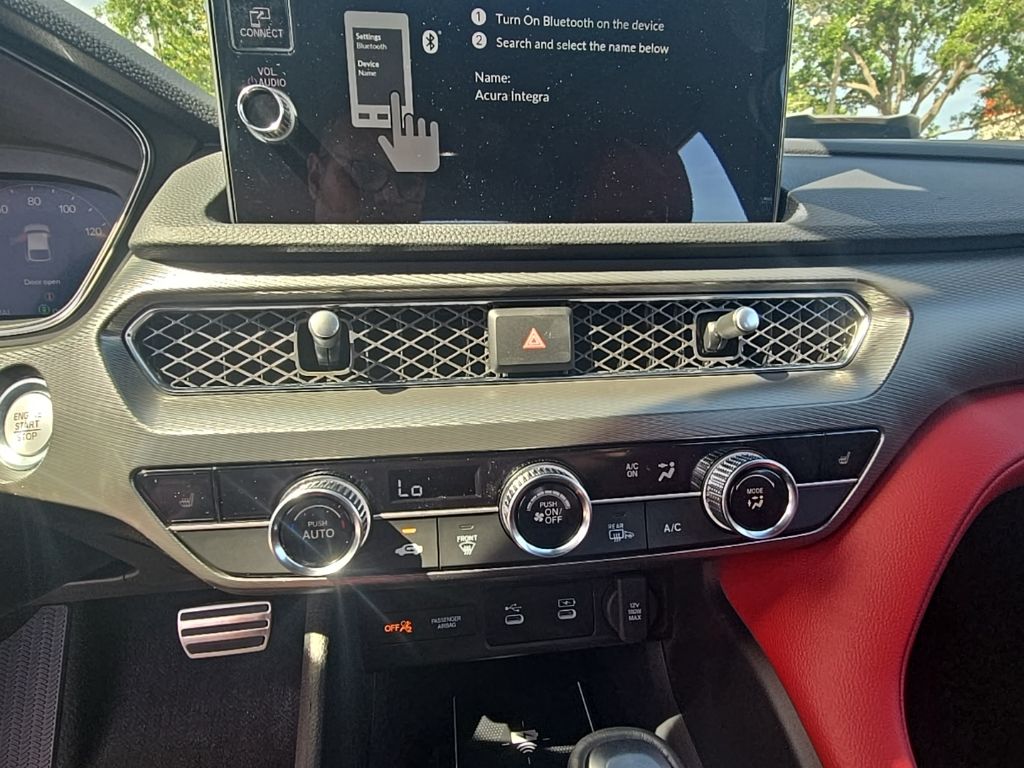 This Integra is well equipped with 4-Wheel Disc Brakes, 8 Speakers, ABS brakes, Air Conditioning, Alloy wheels, AM/FM radio, Apple CarPlay/Android Auto, Auto High-beam Headlights, Auto-dimming Rear-View mirror, Automatic temperature control, Brake assist, Bumpers: body-color, Compass, Delay-off headlights, Driver door bin, Driver vanity mirror, Dual front impact airbags, Dual front side impact airbags, Electronic Stability Control, Four wheel independent suspension, Front anti-roll bar, Front Bucket Seats, Front Center Armrest, Front dual zone A/C, Front fog lights, Front reading lights, Fully automatic headlights, Heated door mirrors, Heated Front Bucket Seats, Heated front seats, Illuminated entry, Knee airbag, Lane departure: Lane Keeping Assist System (LKAS) active, Leather Shift Knob, Leather steering wheel, Leatherette-Trimmed Seating Surfaces, Low tire pressure warning, Occupant sensing airbag, Outside temperature display, Overhead airbag, Overhead console, Panic alarm, Passenger door bin, Passenger vanity mirror, Power door mirrors, Power driver seat, Power moonroof, Power steering, Power windows, Radio data system, Radio: Acura Premium Audio System, Rear anti-roll bar, Rear seat center armrest, Rear side impact airbag, Rear window defroster, Remote keyless entry, Security system, Speed control, Speed-sensing steering, Speed-Sensitive Wipers, Split folding rear seat, Spoiler, Steering wheel mounted audio controls, Tachometer, Telescoping steering wheel, Tilt steering wheel, Traction control, Trip computer, Variably intermittent wipers, and Wheels: 18" x 8J Aluminum-Alloy. Prices shown exclude a destination and handling charge. The destination and handling charge for the Integra and TLX are $1,195 or $1,295, RDX and MDX are $1,195, $1,350 or $1,450. ADX and ZDX are $1,350 or $1,450. Price does not include $1,199 predelivery service fee, tax, title, or license. Optional equipment and accessories available, see dealer for details.