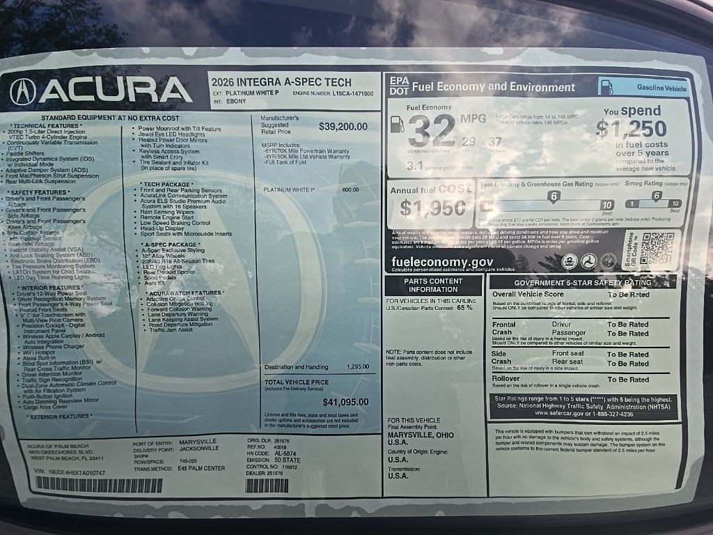 2026 Acura Integra 4D Hatchback A-Spec Tech Package Platinum White Pearl 1.5L I4 DOHC 16V CVT FWD