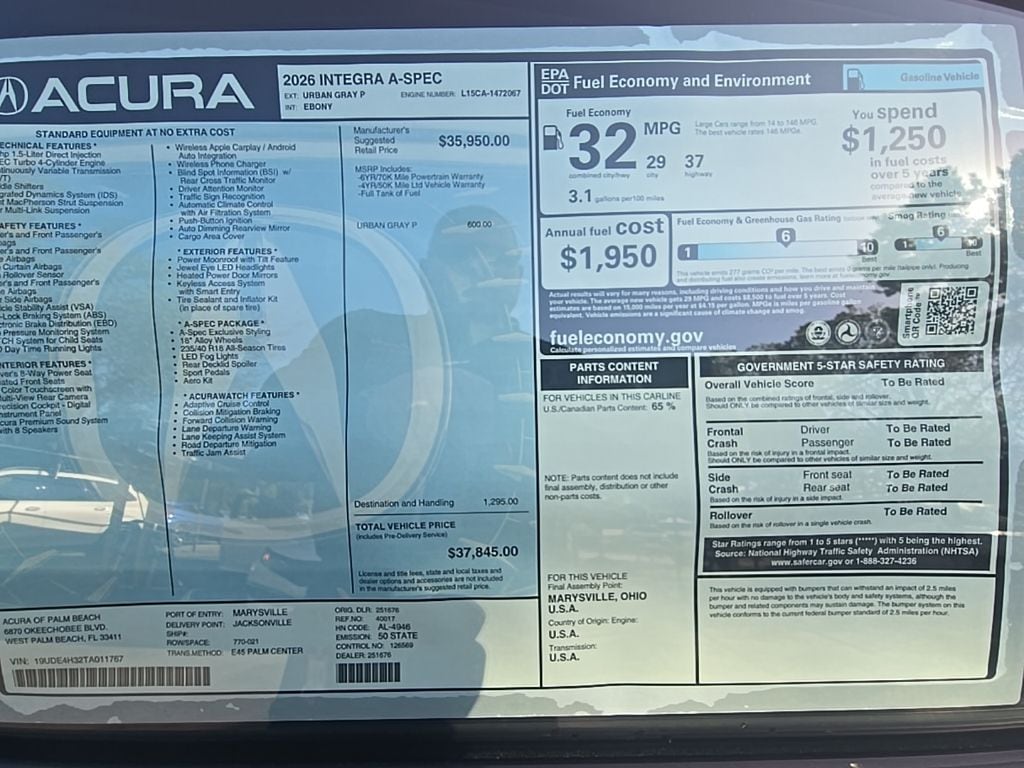 2026 Acura Integra 4D Hatchback A-Spec Package Urban Gray Pearl 1.5L I4 DOHC 16V CVT FWD