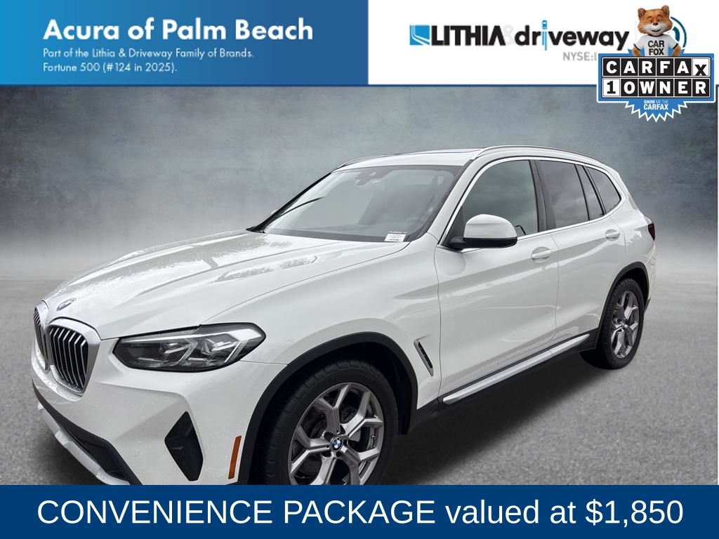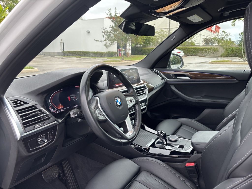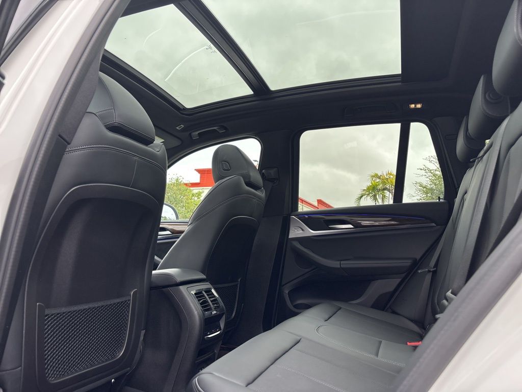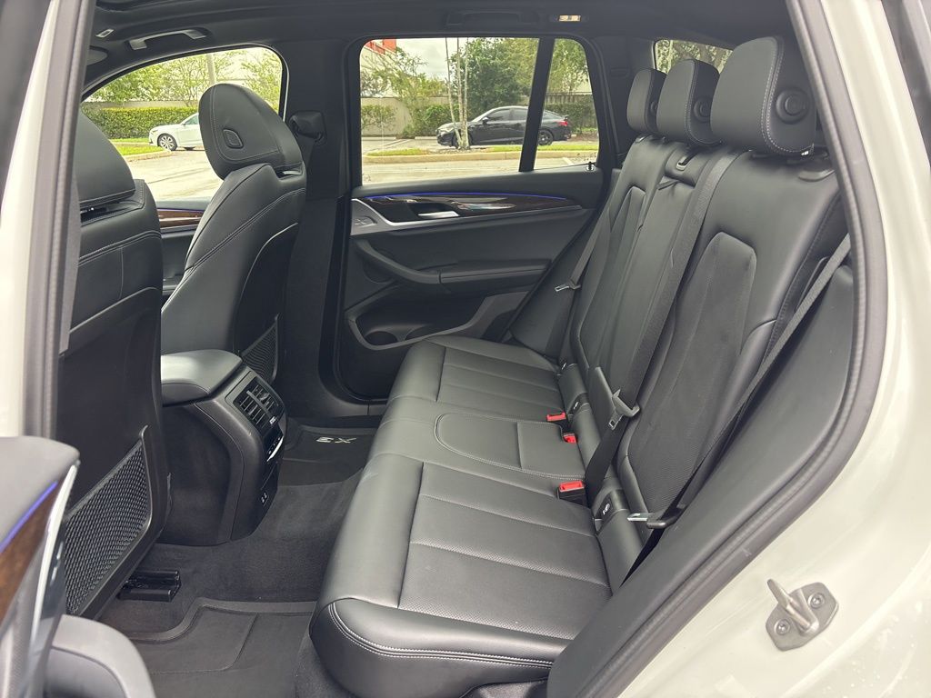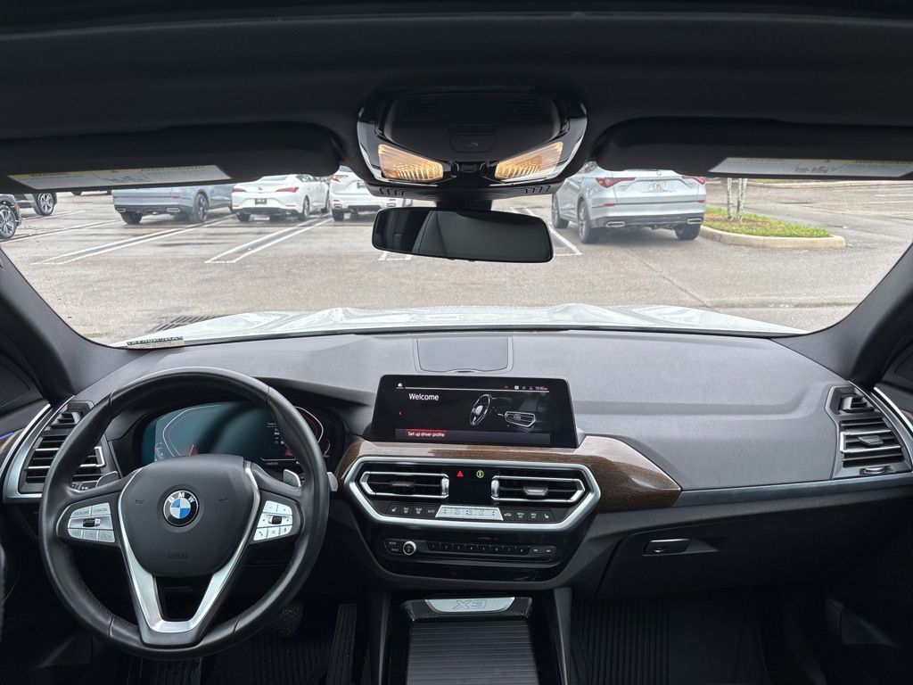 This X3 is well equipped with Connected Package Pro, Convenience Package (Lumbar Support and Panoramic Moonroof), 12 Speakers, 3.385 Axle Ratio, 4-Wheel Disc Brakes, ABS brakes, Air Conditioning, Alloy wheels, AM/FM Radio, AM/FM radio: SiriusXM with 360L, Apple CarPlay & Android Auto Compatibility, Auto High-beam Headlights, Auto-dimming door mirrors, Auto-dimming Rear-View mirror, Automatic temperature control, BMW Assist eCall, BMW TeleServices, Brake assist, Bumpers: body-color, Comfort Access Keyless Entry, ConnectedDrive Services, Delay-off headlights, Driver door bin, Driver vanity mirror, Dual front impact airbags, Dual front side impact airbags, Electronic Stability Control, Emergency communication system: BMW Assist eCall, Enhanced Bluetooth, Exterior Parking Camera Rear, Four wheel independent suspension, Front anti-roll bar, Front Bucket Seats, Front Center Armrest, Front dual zone A/C, Front reading lights, Fully automatic headlights, Garage door transmitter, Genuine wood dashboard insert, Genuine wood door panel insert, Heated door mirrors, Heated Front Seats, Hi-Fi Sound System, Illuminated entry, Knee airbag, Low tire pressure warning, Memory seat, Navigation, Navigation System, Occupant sensing airbag, Outside temperature display, Overhead airbag, Panic alarm, Passenger door bin, Passenger vanity mirror, Perforated SensaTec Upholstery, Power door mirrors, Power driver seat, Power Front Seats, Power Liftgate, Power passenger seat, Power steering, Power windows, Radio data system, Rain sensing wipers, Rear air conditioning, Rear anti-roll bar, Rear reading lights, Rear seat center armrest, Rear window defroster, Rear window wiper, Remote keyless entry, Roof rack: rails only, Security system, SiriusXM w/360L, Speed control, Speed-sensing steering, Speed-Sensitive Wipers, Split folding rear seat, Spoiler, Sport Seats, Sport steering wheel, Steering wheel mounted audio controls, Tachometer, Telescoping steering wheel, Tilt steering wheel, Traction control, Trip computer, Turn signal indicator mirrors, Variably intermittent wipers, Wheels: 19" x 7.5" Y-Spoke (Style 693), and WiFi Hotspot. Price does not include $1,199 predelivery service fee, tax, title, or license. Optional equipment and accessories available, see dealer for details. *Some of our pre-owned vehicles may be subject to unrepaired safety recalls. Check for a vehicle's unrepaired recalls by VIN at http://vinrcl.safercar.gov/vin.