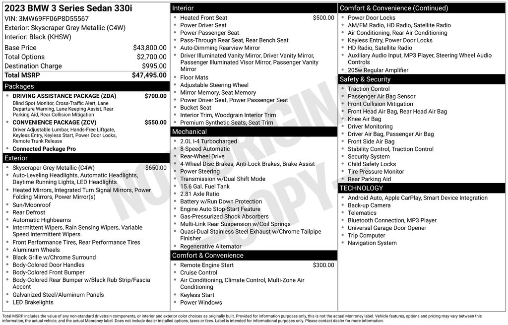 This 3 Series is well equipped with Connected Package Pro, Convenience Package (Comfort Access Keyless Entry and Driver Lumbar Support), Driving Assistance Package (Active Blind Spot Detection, Active Driving Assistant, Lane Departure Warning System, and Park Distance Control), 10 Speakers, 4-Wheel Disc Brakes, ABS brakes, Air Conditioning, Alloy wheels, AM/FM radio: SiriusXM, Apple CarPlay & Android Auto Compatibility, Apple CarPlay Compatibility, Auto High-beam Headlights, Auto-dimming door mirrors, Auto-dimming Rear-View mirror, Automatic temperature control, BMW Assist eCall, BMW Curved Display, BMW TeleServices, Brake assist, Bumpers: body-color, Compass, ConnectedDrive Services, Delay-off headlights, Driver door bin, Driver vanity mirror, Dual front impact airbags, Dual front side impact airbags, Electronic Stability Control, Emergency communication system: BMW Assist eCall, Enhanced USB & Bluetooth Plus Smartphone Integration, Exterior Parking Camera Rear, Four wheel independent suspension, Front anti-roll bar, Front Bucket Seats, Front Center Armrest, Front dual zone A/C, Front reading lights, Fully automatic headlights, Garage door transmitter, Genuine wood console insert, Genuine wood dashboard insert, Heated door mirrors, Heated Front Seats, Hi-Fi Sound System, Illuminated entry, Knee airbag, Leather Shift Knob, Leather steering wheel, Low tire pressure warning, Memory seat, Navigation System, Occupant sensing airbag, Outside temperature display, Overhead airbag, Panic alarm, Passenger door bin, Passenger vanity mirror, Perforated Sensatec Upholstery, Power door mirrors, Power driver seat, Power Front Seats, Power moonroof, Power passenger seat, Power steering, Power windows, Radio data system, Radio: AM/FM Audio System, Rain sensing wipers, Rear air conditioning, Rear anti-roll bar, Rear reading lights, Rear seat center armrest, Rear window defroster, Remote Engine Start, Remote keyless entry, Security system, SiriusXM Satellite Radio w/1 Year Subscription, Speed control, Speed-sensing steering, Speed-Sensitive Wipers, Split folding rear seat, Sport Seats, Sport steering wheel, Steering wheel mounted audio controls, Tachometer, Telescoping steering wheel, Tilt steering wheel, Traction control, Trip computer, Turn signal indicator mirrors, Variably intermittent wipers, Wheels: 18" x 7.5" Lt/Aly Double-Spoke (Style 796), and Widescreen Display. Price does not include $1,199 predelivery service fee, tax, title, or license. Optional equipment and accessories available, see dealer for details. *Some of our pre-owned vehicles may be subject to unrepaired safety recalls. Check for a vehicle's unrepaired recalls by VIN at http://vinrcl.safercar.gov/vin.