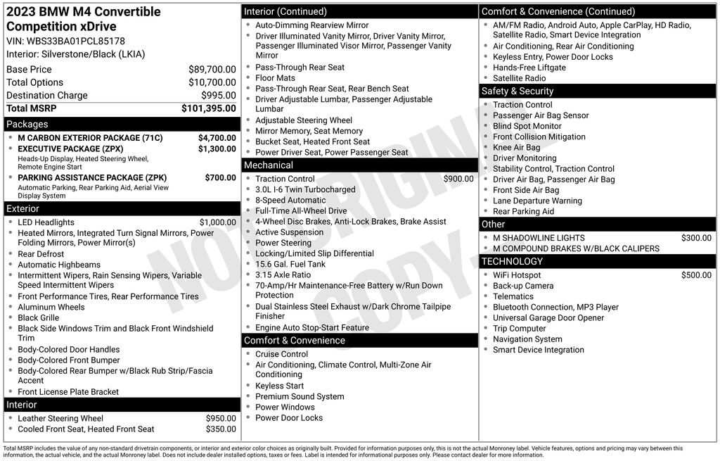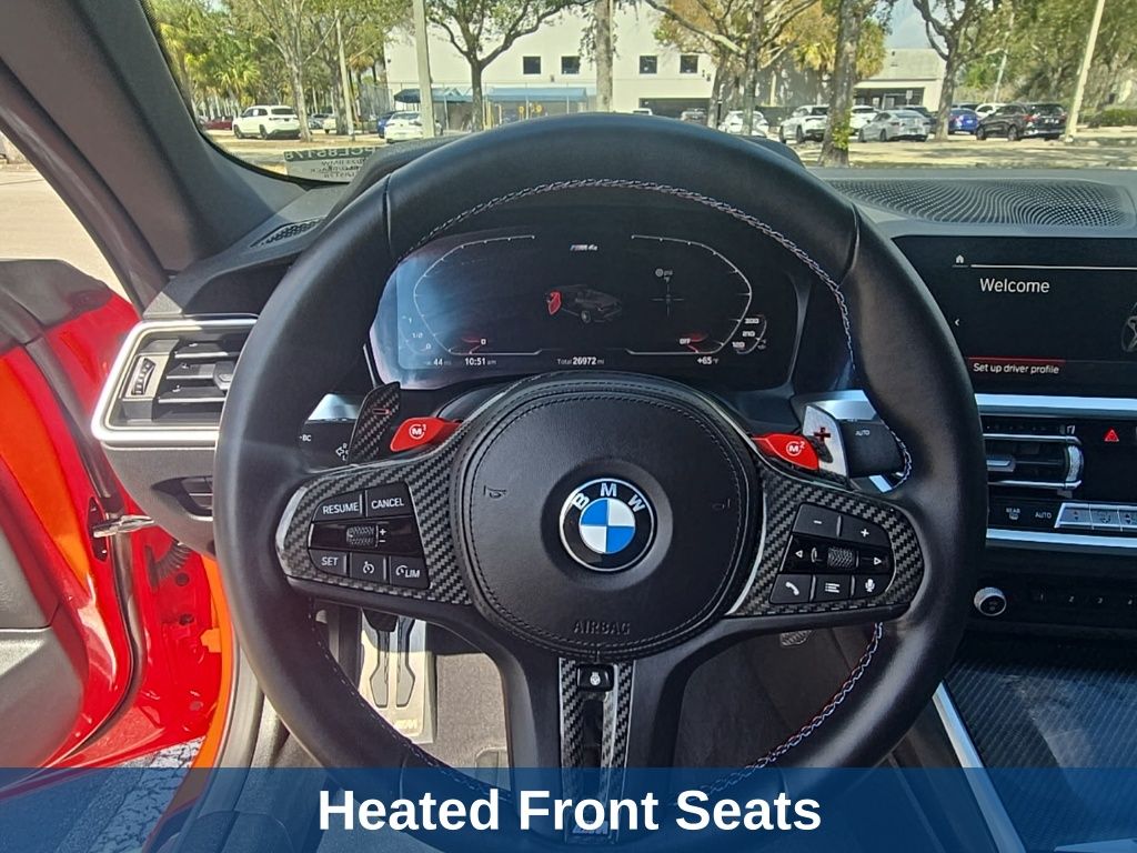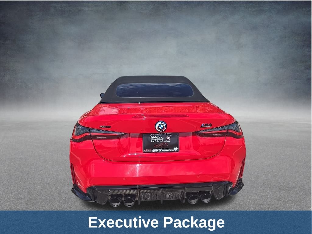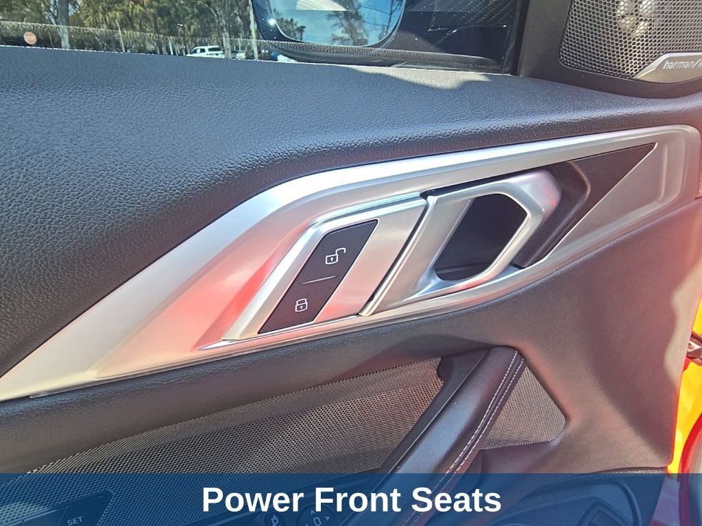 This M4 is well equipped with Executive Package (Head-Up Display, Heated Steering Wheel, and Remote Engine Start), M Carbon Exterior Package, Parking Assistance Package (Parking Assistant Plus), Heated Front Seats, Lumbar Support, M Compound Brakes w/Black Calipers, M Sport Seats, Navigation System, Power Front Seats, Remote keyless entry, 16 Speakers, 4-Wheel Disc Brakes, ABS brakes, Adaptive suspension, Air Conditioning, Alloy wheels, AM/FM radio: SiriusXM, Apple CarPlay & Android Auto Compatibility, Auto High-beam Headlights, Auto-dimming door mirrors, Auto-dimming Rear-View mirror, Automatic temperature control, BMW Assist eCall, BMW TeleServices, Brake assist, Bumpers: body-color, Carbon Fiber Trim, Compass, ConnectedDrive Services, Convertible roof lining, Convertible roof wind blocker, Delay-off headlights, Driver door bin, Driver vanity mirror, Dual front impact airbags, Dual front side impact airbags, Electronic Stability Control, Emergency communication system: BMW Assist eCall, Enhanced USB/Bluetooth Plus Smartphone Integration, Extended Merino Leather Upholstery, Exterior Parking Camera Rear, Four wheel independent suspension, Front anti-roll bar, Front Bucket Seats, Front Center Armrest, Front dual zone A/C, Front reading lights, Front Ventilated Seats, Fully automatic headlights, Garage door transmitter, Glass rear window, harman/kardon Surround Sound System, harman/kardon® Speakers, Heated door mirrors, Heated front seats, Icon Adaptive LED Headlights w/Laserlight, Illuminated entry, Integrated roll-over protection, Knee airbag, Leather Shift Knob, Live Cockpit Pro w/Navi, Low tire pressure warning, M Drive Professional, M Shadowline Lights, Memory seat, Occupant sensing airbag, Outside temperature display, Overhead console, Panic alarm, Passenger door bin, Passenger vanity mirror, Power convertible roof, Power door mirrors, Power driver seat, Power passenger seat, Power steering, Power windows, Radio data system, Radio: AM/FM Audio System, Rain sensing wipers, Rear air conditioning, Rear anti-roll bar, Rear reading lights, Rear seat center armrest, Rear window defroster, Security system, SiriusXM Satellite Radio, Speed control, Speed-sensing steering, Speed-Sensitive Wipers, Sport steering wheel, Steering wheel mounted audio controls, Tachometer, Telescoping steering wheel, Tilt steering wheel, Traction control, Trip computer, Turn signal indicator mirrors, Variably intermittent wipers, Wheels: 19" x 9.5" Fr/20" x 10.5" Rr (Style 826M), Wheels: 19" x 9.5" Fr/20" x 10.5" Rr M Double-Spk, WiFi Hotspot, and Wireless Charging. Price does not include $1,199 predelivery service fee, tax, title, or license. Optional equipment and accessories available, see dealer for details. *Some of our pre-owned vehicles may be subject to unrepaired safety recalls. Check for a vehicle's unrepaired recalls by VIN at http://vinrcl.safercar.gov/vin.