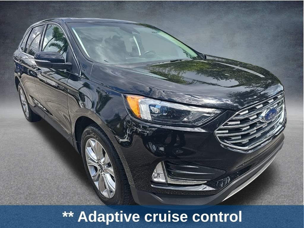 ** Adaptive cruise control, ** Alloy Wheels / Premium Wheels, ** Apple CarPlay/Android Auto, ** Backup Camera, ** Blind Spot Monitor, ** Bluetooth, Hands-Free, ** Brake Assist, ** Cruise Control, ** Heated Seats, ** Keyless Entry, ** Lane Departure Warning, ** Leather Seats, ** LED Headlights, ** Memory Seat, ** Navigation System, ** Premium Sound System / DVD Player, ** Rear Cross Traffic Alert, ** Satellite Radio, ** Security System, ** Stability Control, ** Steering Wheel Controls, ** USB Port, Edge Titanium, 4D Sport Utility, EcoBoost 2.0L I4 GTDi DOHC Turbocharged VCT, 8-Speed Automatic, AWD, Black Metallic, Ebony Leather, 12 Speakers, 3.80 Axle Ratio, 4-Wheel Disc Brakes, ABS brakes, Air Conditioning, Alloy wheels, AM/FM radio: SiriusXM with 360L, Auto High-beam Headlights, Auto-dimming Rear-View mirror, Automatic temperature control, Brake assist, Bumpers: body-color, Compass, Delay-off headlights, Driver door bin, Driver vanity mirror, Dual front impact airbags, Dual front side impact airbags, Electronic Stability Control, Emergency communication system: SYNC 4 911 Assist, FordPass Connect, Four wheel independent suspension, Front anti-roll bar, Front Bucket Seats, Front Center Armrest w/Storage, Front dual zone A/C, Front fog lights, Front reading lights, Fully automatic headlights, Garage door transmitter, Heated door mirrors, Heated front seats, Heated steering wheel, Illuminated entry, Knee airbag, Leather-Trimmed Heated Sport Bucket Seats, Low tire pressure warning, Memory seat, Occupant sensing airbag, Outside temperature display, Overhead airbag, Overhead console, Panic alarm, Passenger door bin, Passenger vanity mirror, Power door mirrors, Power driver seat, Power Liftgate, Power passenger seat, Power steering, Power windows, Radio: B&O Sound System by Bang & Olufsen, Rain sensing wipers, Rear anti-roll bar, Rear reading lights, Rear seat center armrest, Rear window defroster, Rear window wiper, Remote keyless entry, Security system, SiriusXM w/360L, Speed control, Speed-Sensitive Wipers, Split folding rear seat, Spoiler, Steering wheel mounted audio controls, SYNC 4A w/Enhanced Voice Recognition, Tachometer, Telescoping steering wheel, Tilt steering wheel, Traction control, Trip computer, Turn signal indicator mirrors, Variably intermittent wipers, Wheels: 19" Luster Nickel-Painted Aluminum.