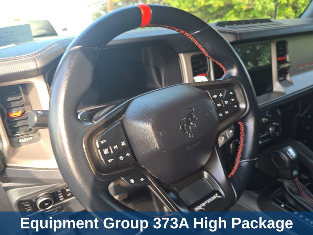 This Bronco is well equipped with Equipment Group 373A High Package, Bronco Raptor, 4D Sport Utility, 3.0L EcoBoost V6, 10-Speed Automatic, 4WD, Azure Gray Metallic Tri-Coat, Black Onyx Vinyl, 4-Wheel Disc Brakes, 4.7 Axle Ratio, 7 Speakers, ABS brakes, Air Conditioning, Alloy wheels, AM/FM radio: SiriusXM with 360L, AM/FM Stereo, Auto High-beam Headlights, Auto-dimming Rear-View mirror, Automatic temperature control, Brake assist, Compass, Connected Navigation, Convertible HardTop, Convertible roof lining, Delay-off headlights, Driver door bin, Driver vanity mirror, Dual front impact airbags, Dual front side impact airbags, Electronic Stability Control, Emergency communication system: 911 Assist, Exterior Parking Camera Rear, Front anti-roll bar, Front Bucket Seats, Front Center Armrest, Front dual zone A/C, Front fog lights, Front reading lights, Front wheel independent suspension, Fully automatic headlights, Glass rear window, Hard Top Sound Deadening Headliner (DISC), Heated door mirrors, Heated front seats, Illuminated entry, Integrated roll-over protection, Leather Shift Knob, Low tire pressure warning, Marine Grade Vinyl Bucket Seats, Navigation system: Connected Navigation, Occupant sensing airbag, Outside temperature display, Overhead airbag, Overhead console, Panic alarm, Passenger door bin, Passenger vanity mirror, Power door mirrors, Power steering, Power windows, Radio data system, Radio: 6 Speakers w/Subwoofer Delete, Rear anti-roll bar, Rear seat center armrest, Rear window defroster, Rear window wiper, Remote keyless entry, Security system, SiriusXM Radio w/360L, Speed control, Split folding rear seat, Steering wheel mounted audio controls, SYNC 4, Tachometer, Telescoping steering wheel, Tilt steering wheel, Traction control, Trip computer, Turn signal indicator mirrors, Variably intermittent wipers, Voltmeter, Wheels: 17" Black High Gloss-