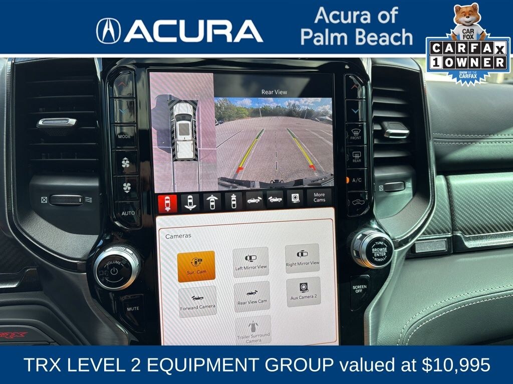This 1500 is well equipped with TRX Carbon Fiber Package (Leather/Carbon Flat-Bottom Steering Wheel and Real Carbon Fiber Interior Accents), TRX Level 2 Equipment Group (2-Door Passive Entry, Front Door Locks, Accent Color Door Handles, Blind Spot & Cross Path Detection, Digital Rearview Mirror, Driver Seat Memory, Driver/Passenger Wrapped Assist Handles, Exterior Mirrors w/Memory, Front Door Accent Lighting, Full Length Premium Upgraded Floor Console, harman/kardon 19 Speaker Premium Sound, Heads-Up Display, Heated Second Row Seats, Heated Steering Wheel, IP LED Ambient Light Pipe, Leather Trimmed Bucket Seats, Leather/Suede Flat-Bottom Steering Wheel, LED CHMSL Lamp, Luxury Front Door Trim Panel, MOPAR Bright Pedal Kit, ParkSense Front/Rear Park Assist w/Stop, Pick-Up Box Lighting, Power 8-Way Driver & Passenger Seats, Power Adjustable Pedals w/Memory, Premium Wrapped IP Bezel, Radio/Driver Seat/Mirrors/Pedals Memory, Rain Sensitive Windshield Wipers, Rear 60/40 Folding Split Recline Seat, Rear Door Accent Lighting, Rear Underseat Compartment Storage, Rear Window Defroster, Remote Tailgate Release, Sun Visors w/Illuminated Vanity Mirrors, Surround View Camera System, Trailer Brake Control, Universal Garage Door Opener, Ventilated Front Seats, Ventilated Rear Seats, Wireless Charging Pad, #2 Seat Foam Cushion, 4 Way Front Headrests, Bucket Seats, Center Console Parts Module, Front Seat Back Map Pockets, Heated Front Seats, Power 4-Way Driver Lumbar Adjust, Power 4-Way Passenger Lumbar Adjust, and Rear 60/40 Folding Seat), Advanced Safety Group (Adaptive Cruise Control w/Stop & Go, Lane Keep Assist, Pedestrian Emergency Braking, and Tailgate Ajar Warning Lamp), Bed Utility Group (MOPAR 4 Adjustable Cargo Tie-Down Hooks, MOPAR Deployable Bed Step, and MOPAR Spray In Bedliner), Quick Order Package 29Y, Trailer Tow Group (Trailer Light Check and Trailer Tire Pressure Monitoring System), 10 Speakers, 3.55 Rear Axle Ratio, 4-Wheel Disc Brakes, ABS brakes, Adaptive suspension, Air Conditioning, Alloy wheels, AM/FM radio: SiriusXM with 360L, Apple CarPlay/Android Auto, Auto High-beam Headlights, Auto-dimming door mirrors, Auto-dimming Rear-View mirror, Automatic temperature control, Black Exterior Mirrors, Black Power-Fold Trailer Tow Mirrors, Brake assist, Cloth/Vinyl Bucket Seats, Compass, Delay-off headlights, Dome Dual LED