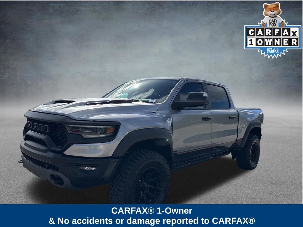 Recent Arrival! CARFAX One-Owner. Billet Silver Metallic Clearcoat 2023 Ram 1500 4D Crew Cab TRX 6.2L Supercharged HEMI V8 SRT 4WD 8-Speed Automatic Clean CARFAX.